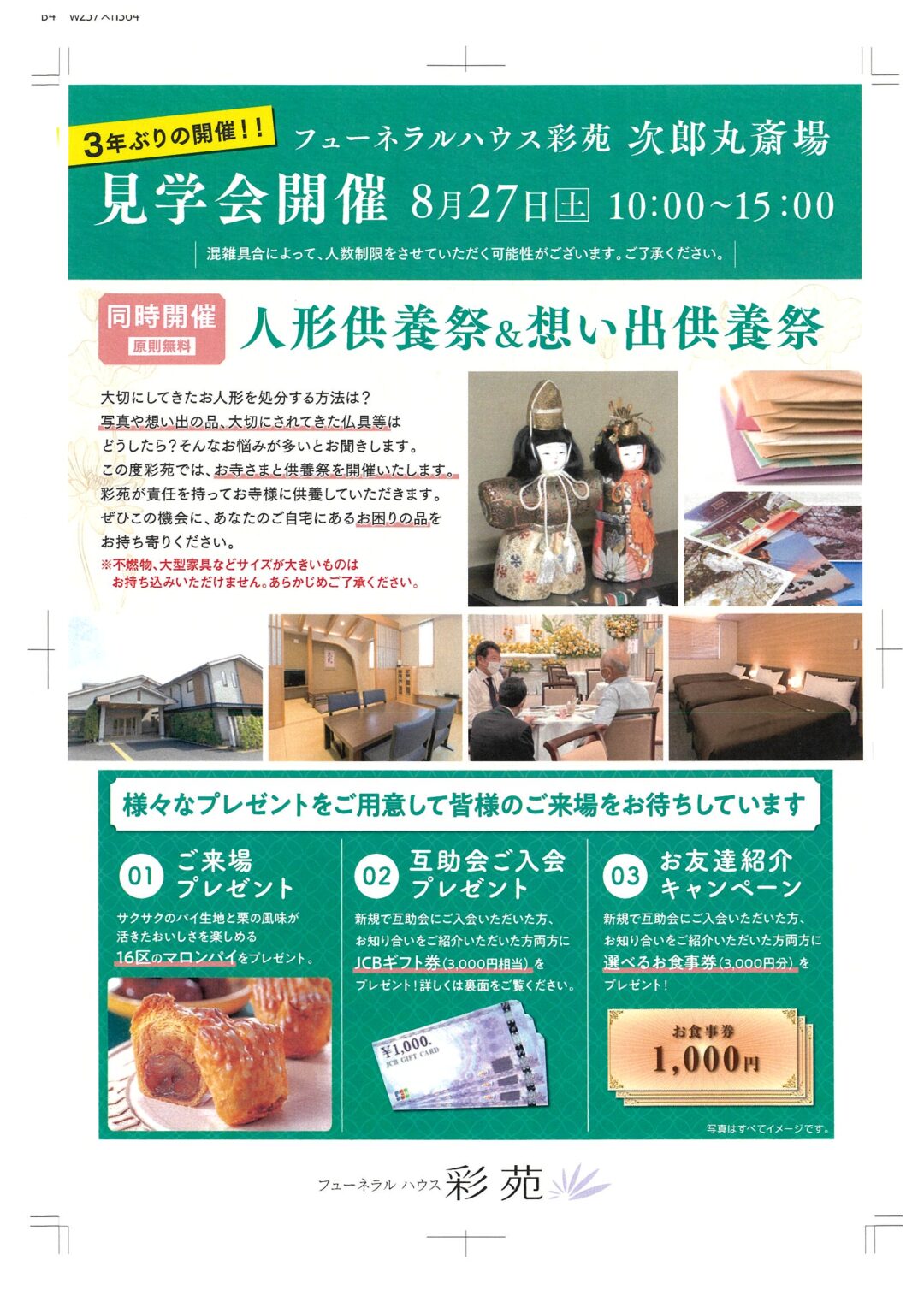 開催日時:2022.08.27 (土) 3年ぶりに斎場見学会開催します。また、同時に人形供養祭と想い出供養祭も行います。/home/xs908875/quwadate.com/public_html/saien-test.quwadate.com/wp-content/themes/sen/archive-event_detail.php on line 235