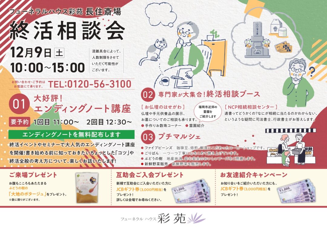 開催日時:2023.12.09 (土) 福岡市南区の長住斎場にて、終活相談会・エンディングノート講座を開催します。プチマルシェも同時開催します。ぜひお立ち寄りください。/home/xs908875/quwadate.com/public_html/saien-test.quwadate.com/wp-content/themes/sen/archive-event_detail.php on line 235