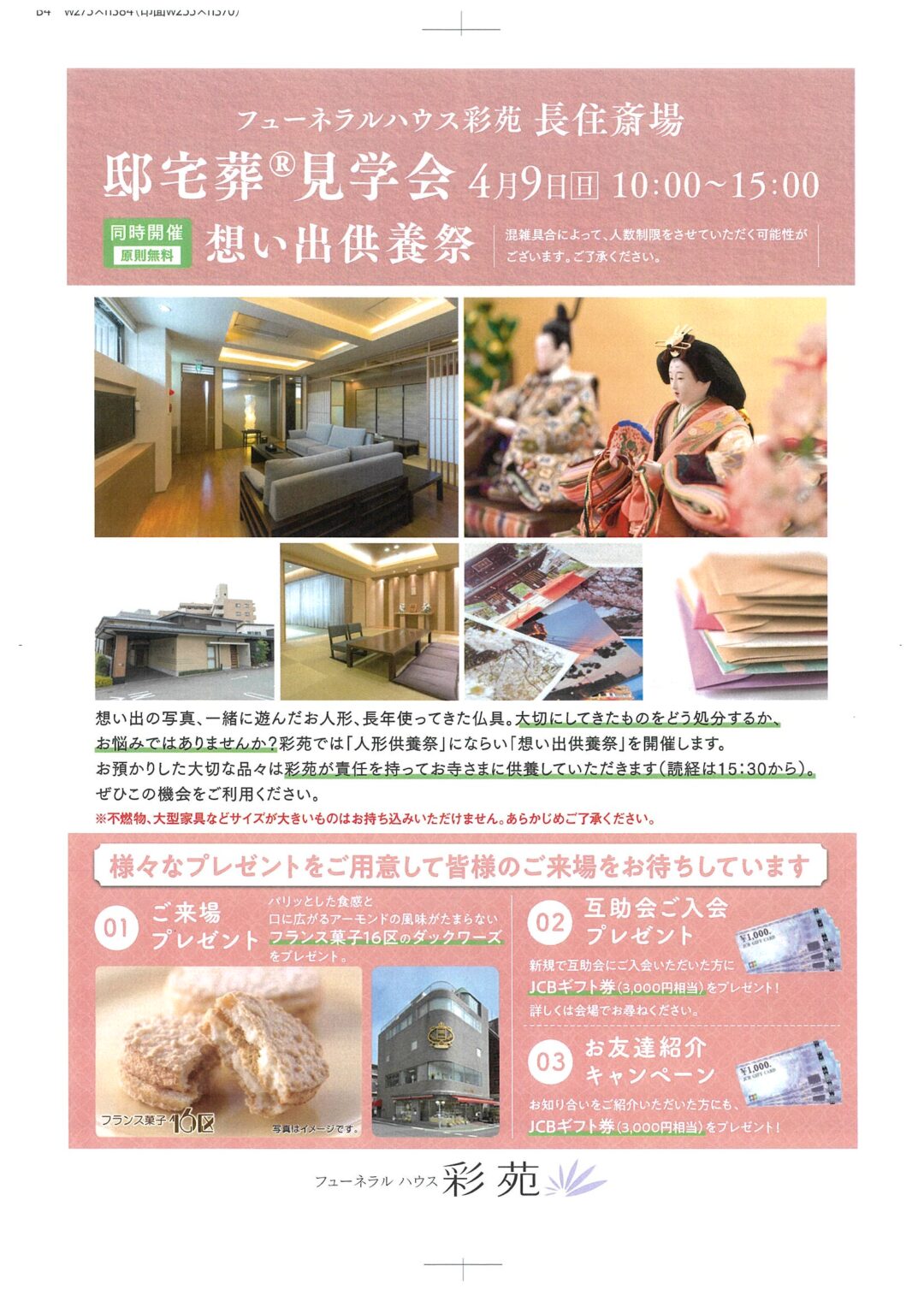 4月9日に長住斎場で見学会・想い出供養祭を開催します。