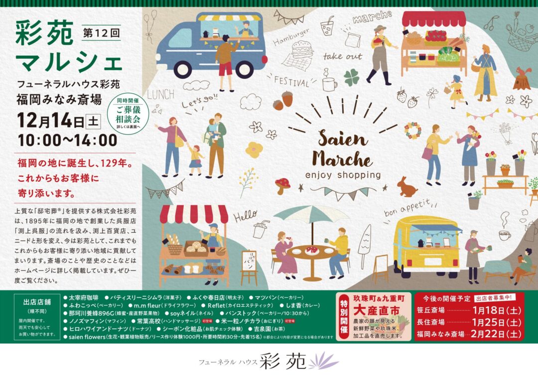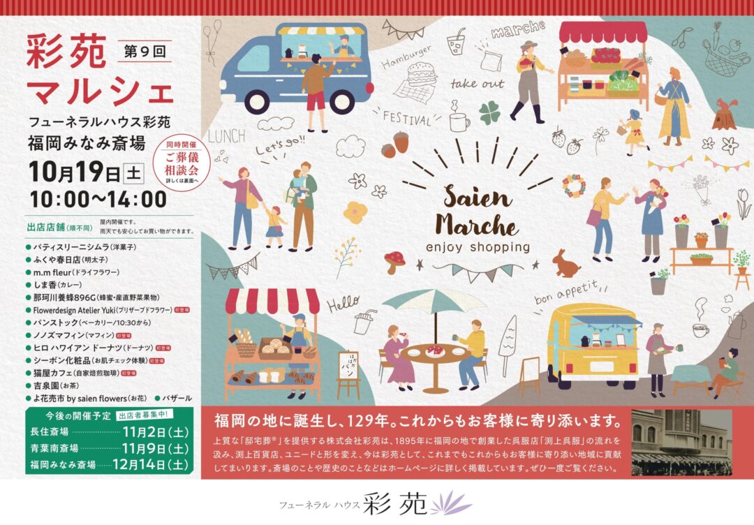 彩苑は福岡の地に創業し130年、そんな彩苑だからこそ故人様の想いやご家族の皆さまの感謝の気持ちをしっかり汲み取ったサービスを行います。専属のフラワーコーディネーターが作ったお花や故人様に好きなお洋服を着せてあげること、思い出を分かち合うメモリアルコーナーなど、最期にふさわしいお別れをご提供します。