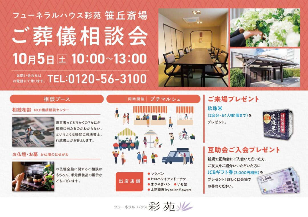彩苑には、葬儀費用の負担を軽減するための互助会がございます。ご入会いただくことで、お支払いいただく葬儀費用のうち、基本料金分が互助会特典適用額で積立が出来ますので、いざというときのご負担が軽減されます。 彩苑の互助会は月々3,000円からの積立が可能で、基本料金から約22万円以上の会員特典がございます。詳しくはお問い合わせください。