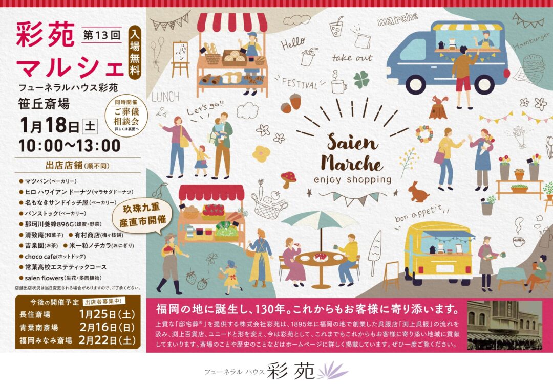 彩苑は福岡の地に創業し130年、そんな彩苑だからこそ故人様の想いやご家族の皆さまの感謝の気持ちをしっかり汲み取ったサービスを行います。専属のフラワーコーディネーターが作ったお花や故人様に好きなお洋服を着せてあげること、思い出を分かち合うメモリアルコーナーなど、最期にふさわしいお別れをご提供します。