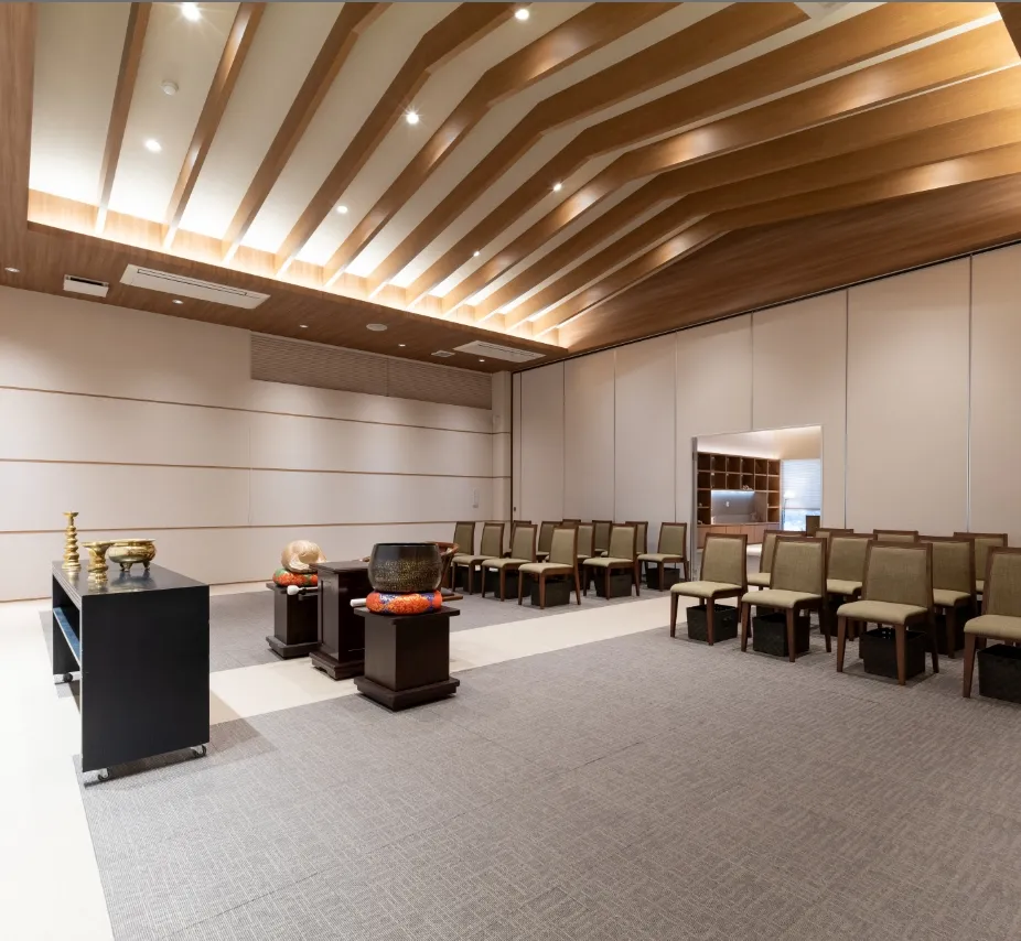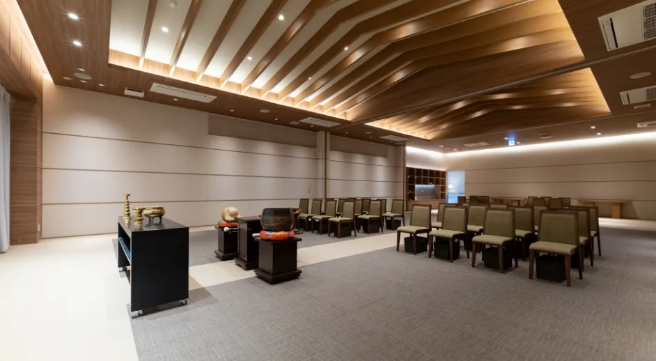 135㎡の広々としたホールがある本館は、参列者の皆さまがゆったりとした空間の中で、温かな思い出に包まれながらお別れの時間を共有することができます。ホールは人数によって空間を調整することが可能です。